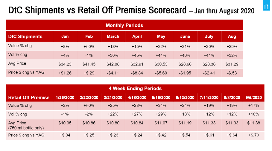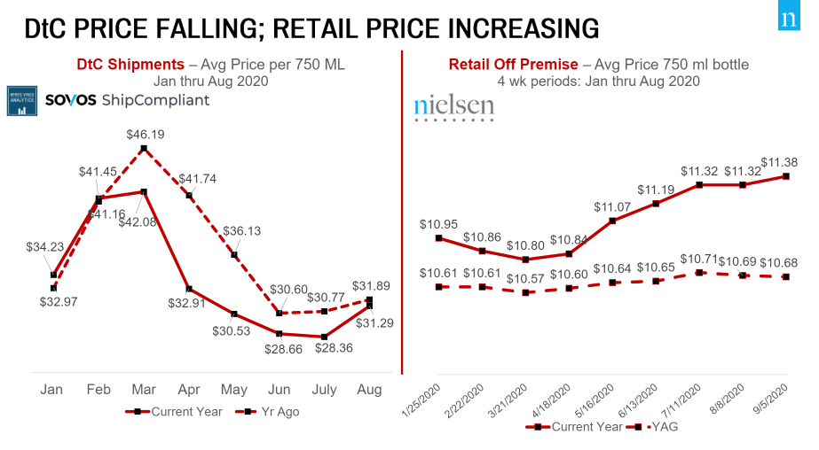 - The average bottle price for DtC shipments in August was $31.29, barely changing from the 2019 price in August of that year.