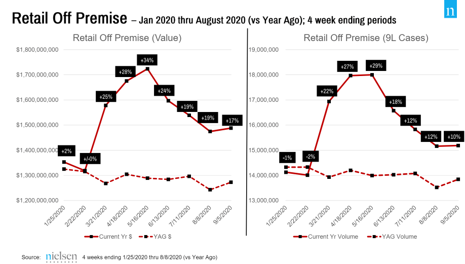 - Off-premise retail sales value growth continues to outpace volume growth resulting in a continued upward trend in price points every month since March.