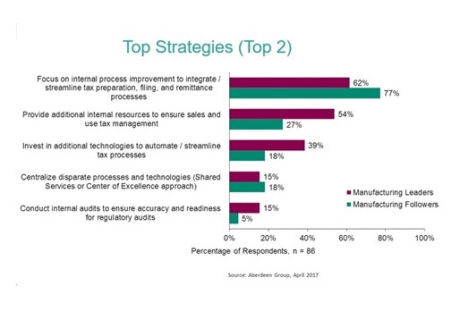 Thank you again for joining us on May 16 for our latest Tax Tuesday Webinar, Sales and Use Tax Process Benchmarks and Best Practices for Manufacturers. During this webinar, Mark Christenson and I shared results of a recent Aberdeen Benchmark Study that contained responses from Tax, IT and Finance managers and leaders from over 100 manufacturers of various sizes about: