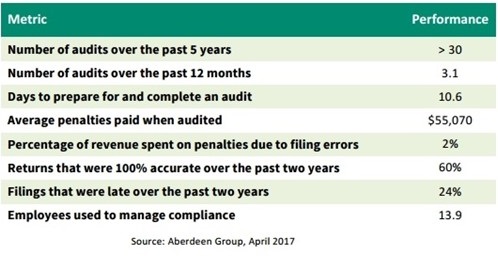 The following table from the Aberdeen study shows how survey takers identify their performance across a wide variety of metrics. Today, on average, manufacturers are spending a significant amount of time on audits, producing a large amount of returns that are inaccurate or late, and paying substantial fines.