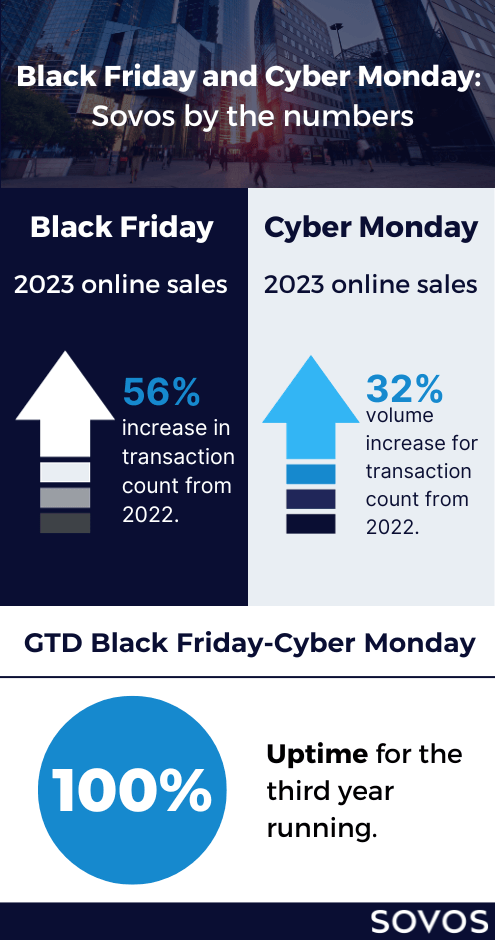 Sovos has prioritized investing in products and infrastructure to ensure seamless performance during these peak spending periods. From 24/7 monitoring to the state of Active/Active in place, Sovos teams are constantly working to give clients the best experience possible. This was recognized during Black Friday and Cyber Monday as uptime was 100%, with the integration adapter also at 100% with no interruptions.