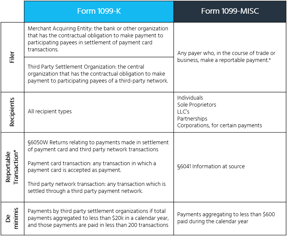 Aside from the payment method, the notable reportable requirement differences between these forms lies in the de minimis rules. For third party settlement organizations, a form 1099-K is not required to be reported to the taxpayer and to the IRS unless the recipient received income totaling more than 200 transactions and when those payments equaled at least $20k during the calendar year.