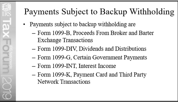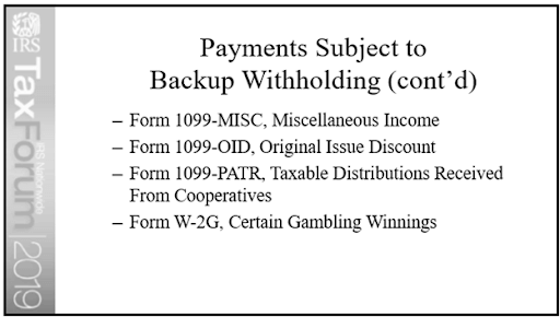 Since backup withholding applies to a variety of payments and other Forms 1099, Sovos clarified whether the IRS intends to penalize payers for similar withholding discrepancies found on other Forms 1099. Lauer referenced a couple of slides (see below) from his presentation at the Nationwide Tax Forum that listed all Forms 1099 currently subject to backup withholding and confirmed that they will expand the program to include all of these forms in due course.