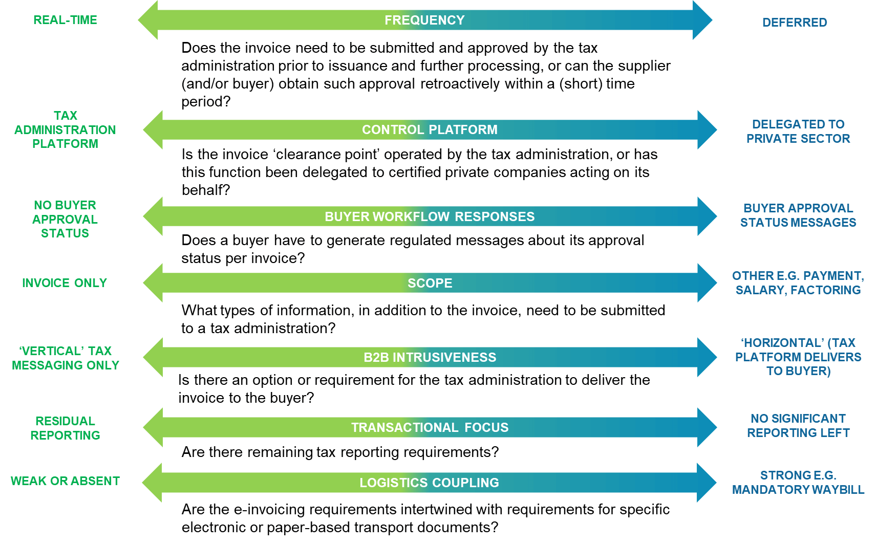 Figure 4 below shows the principal ways in which ‘clearance’ e-invoicing regimes can differ among jurisdictions.