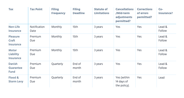 Whilst the majority of commonly reported non-life taxes are mentioned above, additional taxes may be applicable to policies located in Denmark and therefore cannot be disregarded.