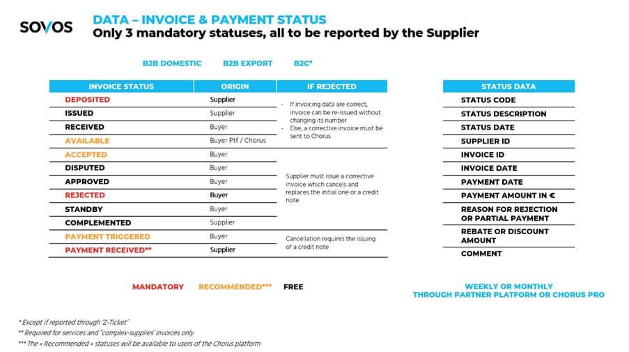 Here is a slide from our webinar showing invoice statuses, whether these are mandatory, recommended, or free, origins, action to take if rejected, status data, and when it needs to be reported: