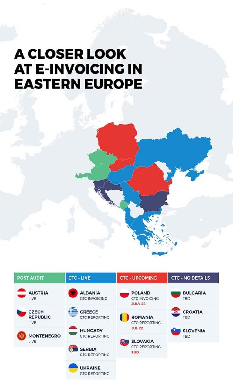 Tax regulations in Eastern European countries are complex but that shouldn’t be a reason not to do business there. If you’re responsible for VAT compliance, this ebook provides key details of the varying VAT digitisation mandates and business requirements across the region: