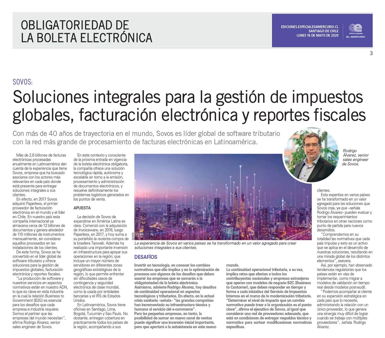 Más de 2,6 billones de facturas electrónicas procesadas anualmente en Latinoamérica dan cuenta de la experiencia que tiene Sovos, empresa que ha buscado asociarse con los actores más relevantes en cada país donde está presente para entregar soluciones integrales a sus clientes.