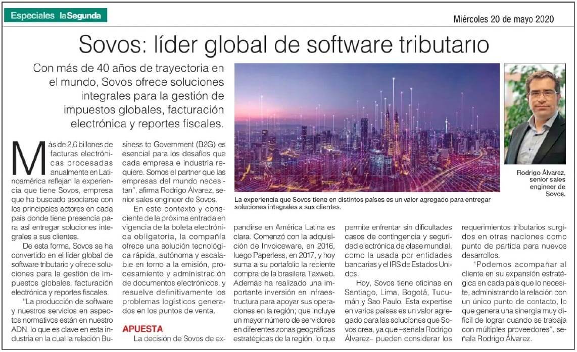 De esta forma, Sovos se ha convertido en el líder global de software tributario y ofrece soluciones para la gestión de impuestos globales, facturación electrónica y reportes fiscales. “La producción de software y nuestros servicios en aspectos normativos están en nuestro ADN, lo que es clave en esta industria en la cual la relación Business to Government (B2G) es esencial para los desafíos que cada empresa e industria requiere. Somos el partner que las empresas del mundo necesitan”, afirma Rodrigo Álvarez, senior sales engineer de Sovos.
