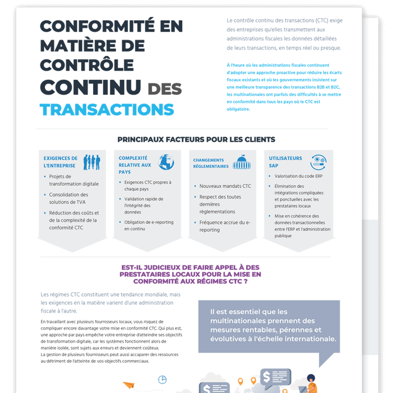 Les administrations fiscales sont de plus en plus présentes dans les processus de facturation ou demandent de plus en plus de détails dans les heures ou les jours qui suivent les transactions. Sovos vous permet de répondre à ces exigences via à une solution rentable, sécurisée et mondiale, qui renforce la résistance aux perturbations engendrées par cette tendance mondiale de contrôle continu des transactions (CTC).