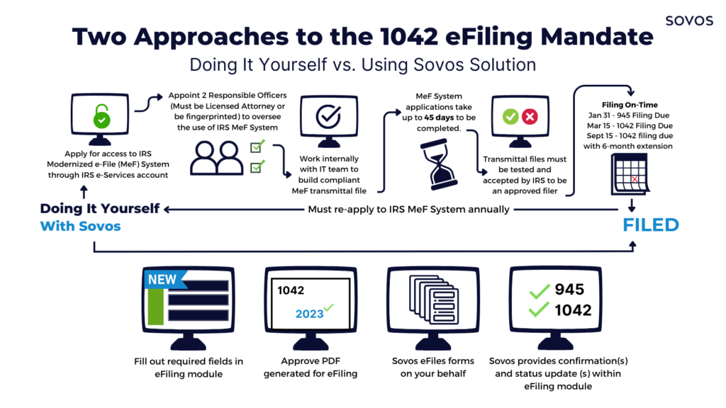 Filing Form 1042 electronically requires access to the IRS’ MeF system. The registration process is not an easy or quick process – in fact, it can take months to complete from beginning to end and has to be renewed each year.