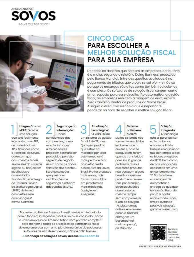 A Sovos foi destaque na Revista Exame com a matéria “Cinco dicas para melhorar a Solução Fiscal da sua empresa”. A reportagem mostra como superar os desafios tributários que cercam as empresas com softwares que automatizam a gestão fiscal e reduzem a margem de erro, como as soluções desenvolvidas pela Sovos. Confira!