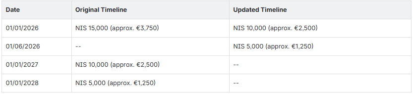 Under the original implementation schedule, businesses were subject to a gradually decreasing threshold that would have reached NIS 5,000 only by 1 January 2028. However, the new legislation significantly accelerates this timeline: