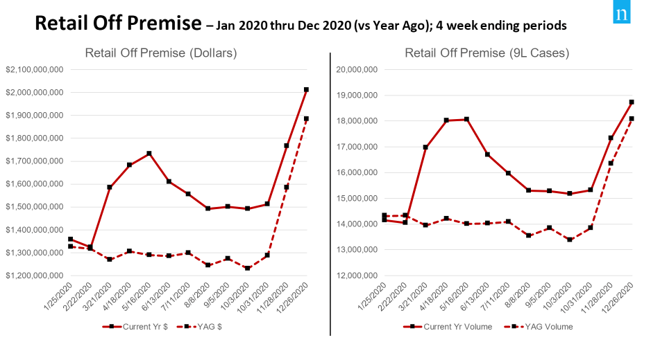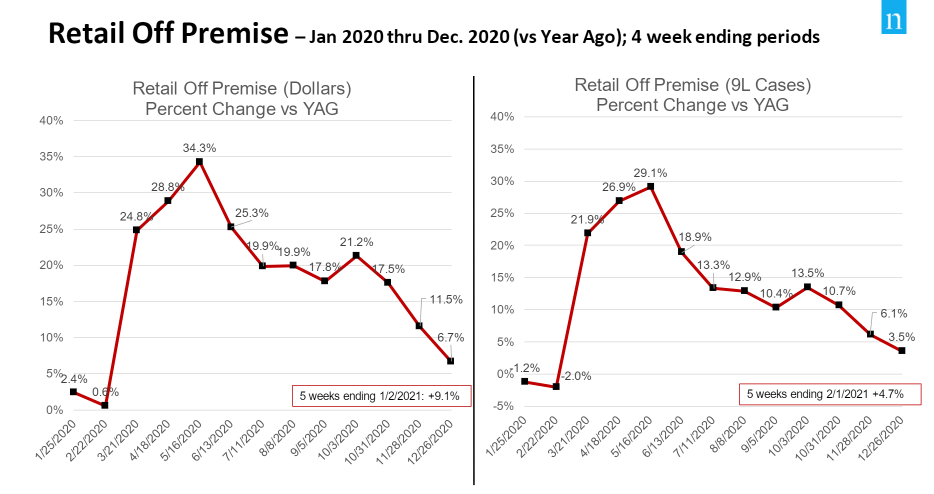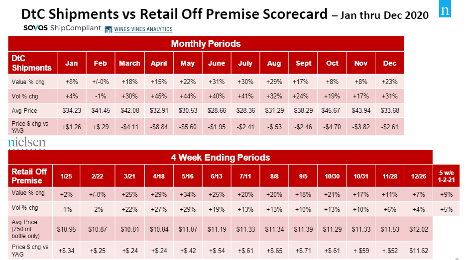 - As of December 2020, DtC shipments reached $3.7B or 8.4M cases and retail off-premise sales hit $20B or 211M cases, continuing its deceleration of growth.