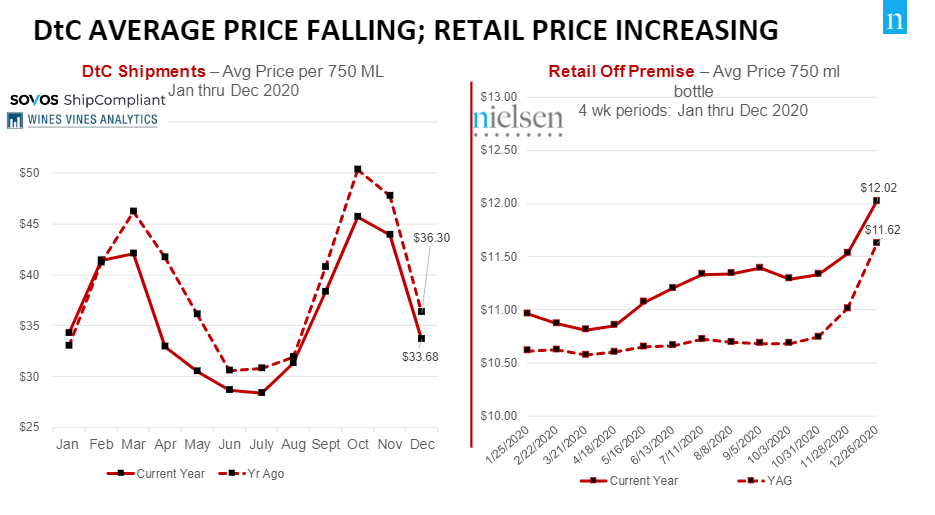 - For DtC shipments, large wineries, those producing over 500K cases annually, continued to have the lowest average price per bottle and the highest growth.