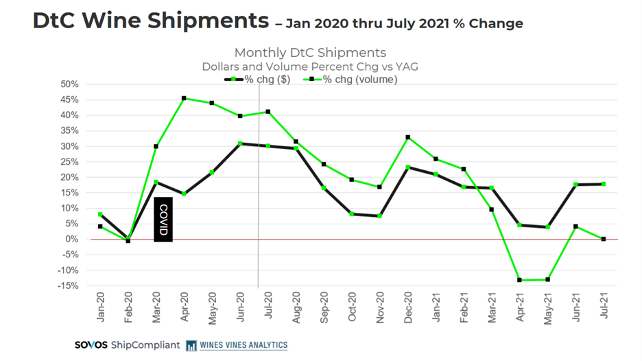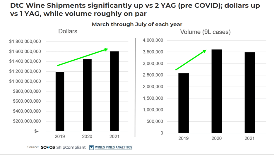 - Versus two years ago (pre-COVID), DtC shipment growth continues to be very robust – +41% on volume and +53% on dollars – a strong indication that many wineries have adapted in expanding the effectiveness and efficiency of their DtC business.