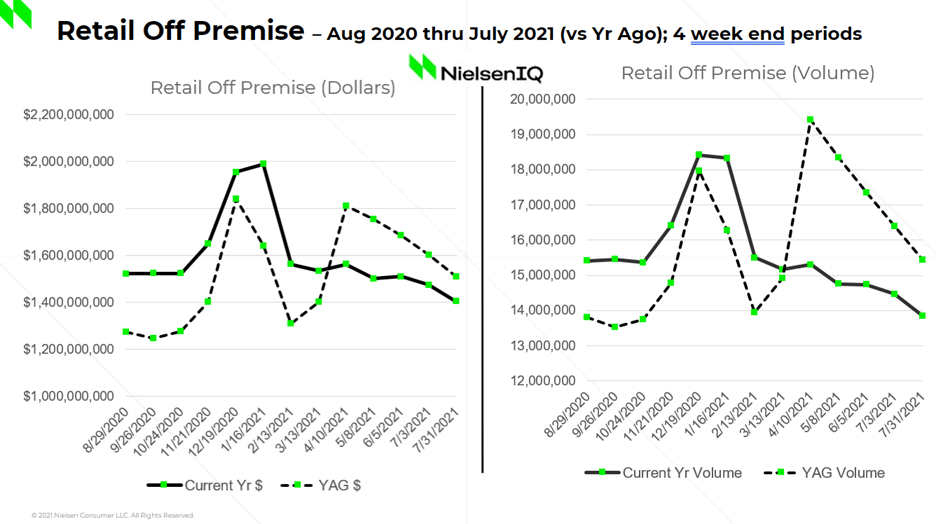 - In July, retail off-premise sales reached $1.4B and 13.8K cases.