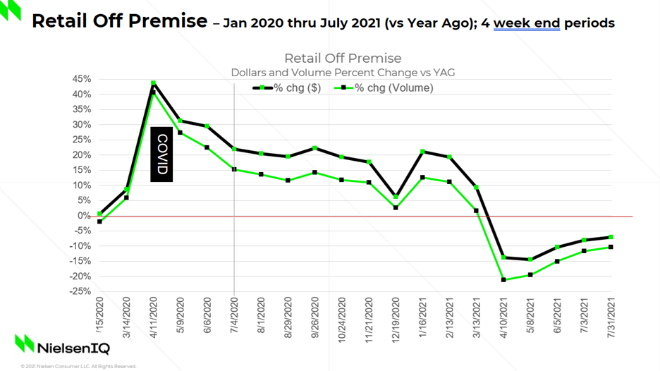 - As expected, with the return to the on-premise (to some degree), along with comparisons to large year ago comps in the off-premise, sales in this channel declined – though the rate of decline continued to moderate versus where it was in April and May.