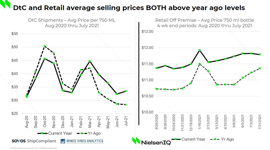 We are now comparing to COVID-impacted periods from last year, with the on-site tasting room business continuing to return. Volume growth fell double digits versus a year ago for the second consecutive month. The DtC shipment channel is proving to be considerably more resilient than wine sales in retail off-premise. The average bottle price shipped is well above the levels we saw one year ago (and is closer to the DtC average bottle prices of 2 years ago) – to almost $5 more than levels from one year ago.