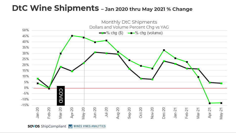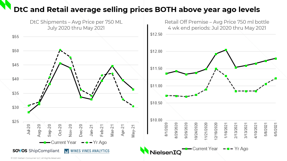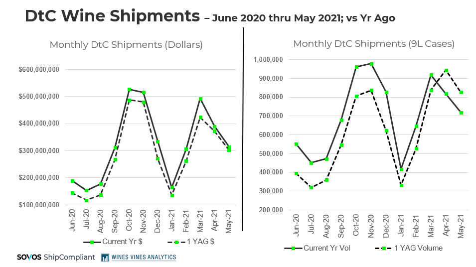 Similar to last month, we are now comparing to COVID-impacted periods from last year and the on-site tasting room business continues to return. Volume growth fell double digits versus a year ago for the second consecutive month. Like April though, May dollar growth was still positive. Consequently, the average bottle price shipped rose almost $6 versus levels from one year ago.