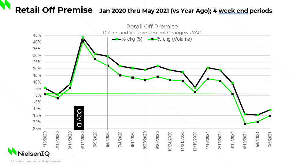 - With comparisons against COVID-impacted months a year ago and some channel shifting back to on-premise, it again is not surprising that wine off-premise retail sales fell significantly versus one year ago – it is down double digits on dollars, and even larger volume declines.