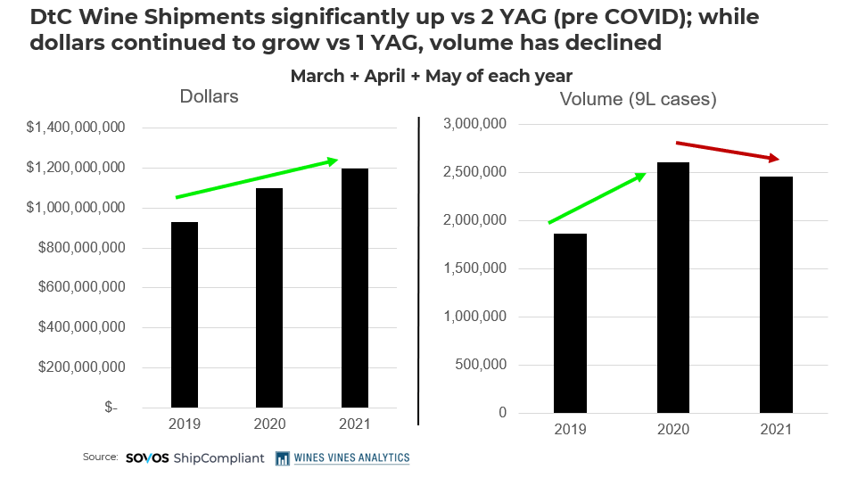 - Versus two years ago (pre-COVID), DtC shipment growth continued to be very robust – in the +25% percent range on both dollars and volume. This is likely a result of both on-site tasting room business not yet being where it was pre-COVID, and wineries having adapted in expanding the effectiveness and efficiency of their DtC business beyond the tasting room during COVID.