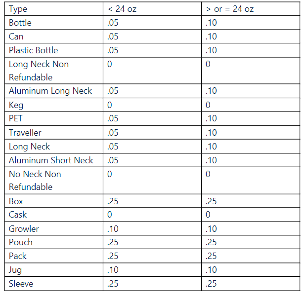 These fees pertain to consumable beverages and have a tax rate based on the underlying goods. Fees are based on product information, specifically Container Type and Container Size. Be sure to include this information in product API syncs or add it manually in your ShipCompliant account.