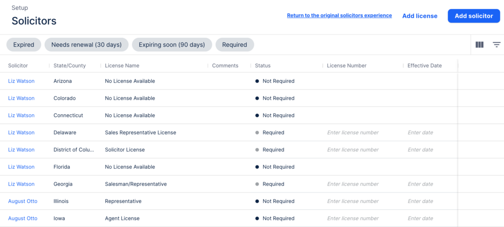 - Quick filter buttons: you’ll get visibility into your solicitor license statuses with quick filter buttons, to see what’s required, expired or expiring soon.