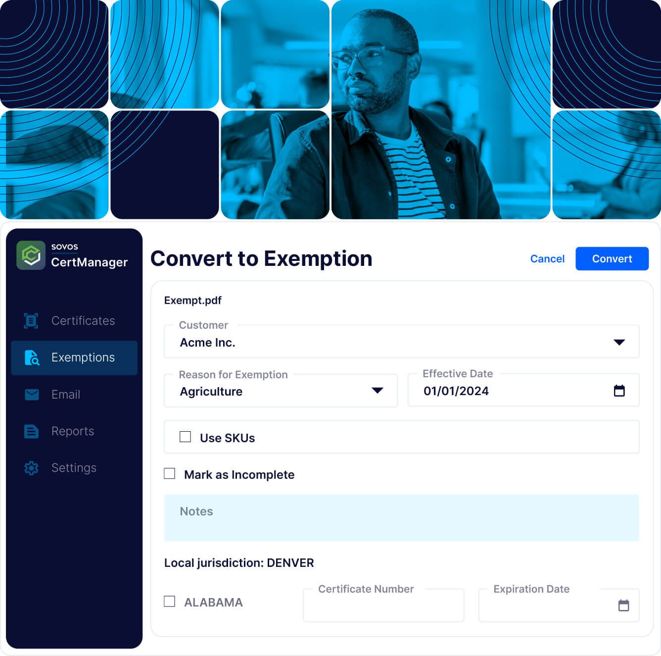 Sovos CertManager is a tax exemption certificate management software designed to streamline the process of handling customer exemption certificates, thereby reducing the risk of audits and ensuring compliance